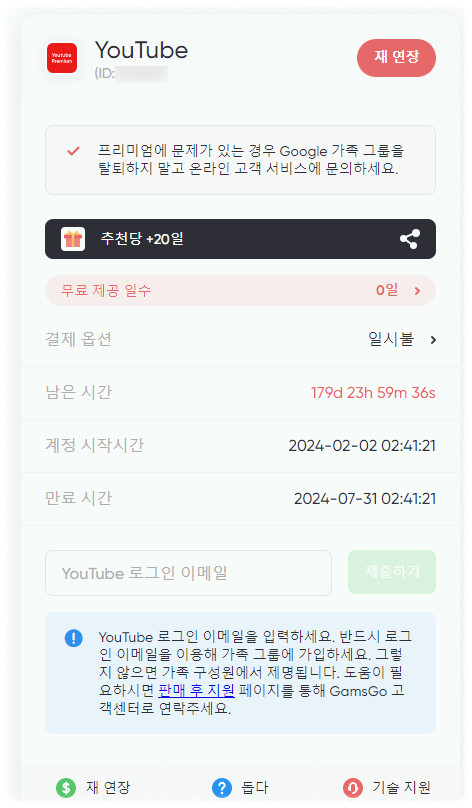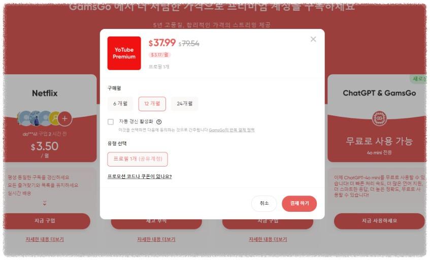 겜스고에서는 프리미엄 요금제만 제공하고 있으며, 현재 할인 행사도 진행 중입니다. 결제는 1개월, 3개월, 6개월, 12개월로 가능하며, 12개월 결제가 가장 저렴한 할인율을 제공합니다. 12개월 기준으로 요금은 36.99달러로, 현재 환율로 계산하면 약 49,500원이 됩니다. 이는 넷플릭스의 프리미엄 요금제와 비교했을 때 매우 저렴한 가격입니다.