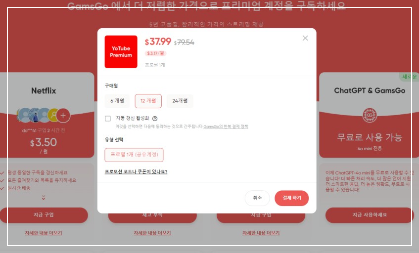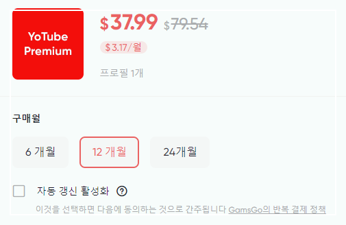 또한, 겜스고는 디즈니플러스, 넷플릭스 등 다른 구독 서비스도 동일한 방식으로 저렴하게 이용할 수 있는 장점이 있습니다. 자동 갱신 기능을 활성화하면 결제된 구독이 끝났을 때 자동으로 등록된 카드로 이어서 결제가 이루어지며, 추가 1달러 할인도 제공됩니다. 이처럼 간편한 절차를 통해 유튜브 프리미엄에 가입할 수 있습니다.